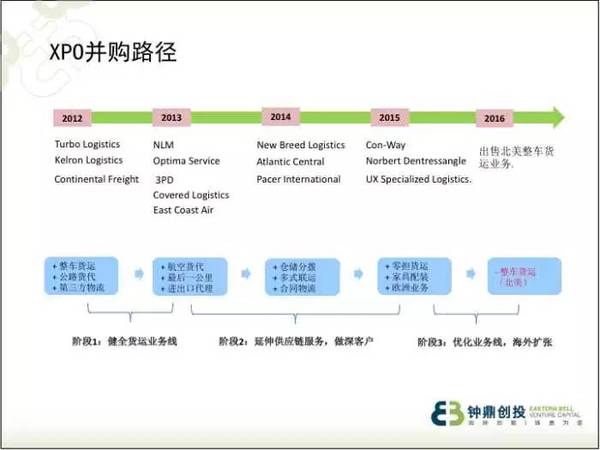 2011年開始,XPO公司陸續收購了15家物流上市公司,涵蓋多式聯運、國際貨代、零擔、整車、3PL等細分,公司市值6年間增加了近10倍。這是物流上市公司進行行業整合的典范,值得中國物流上市公司借鑒。XPO公司并購過程如下: