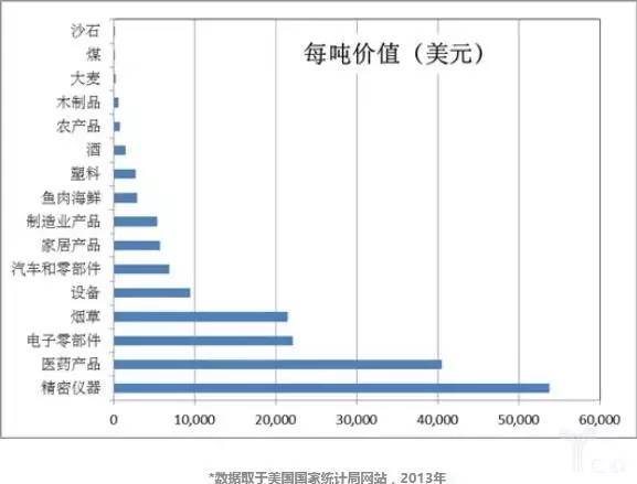 同樣一公斤貨,因為單公斤貨物價值的不同會對GDP產生很大影響。為了更好理解這個概念,我準備了下面一張圖表,是美國不同類別的貨物平均每噸的價值,可以看到差別非常大,一噸煤和一噸煙草價值可以相差100倍。